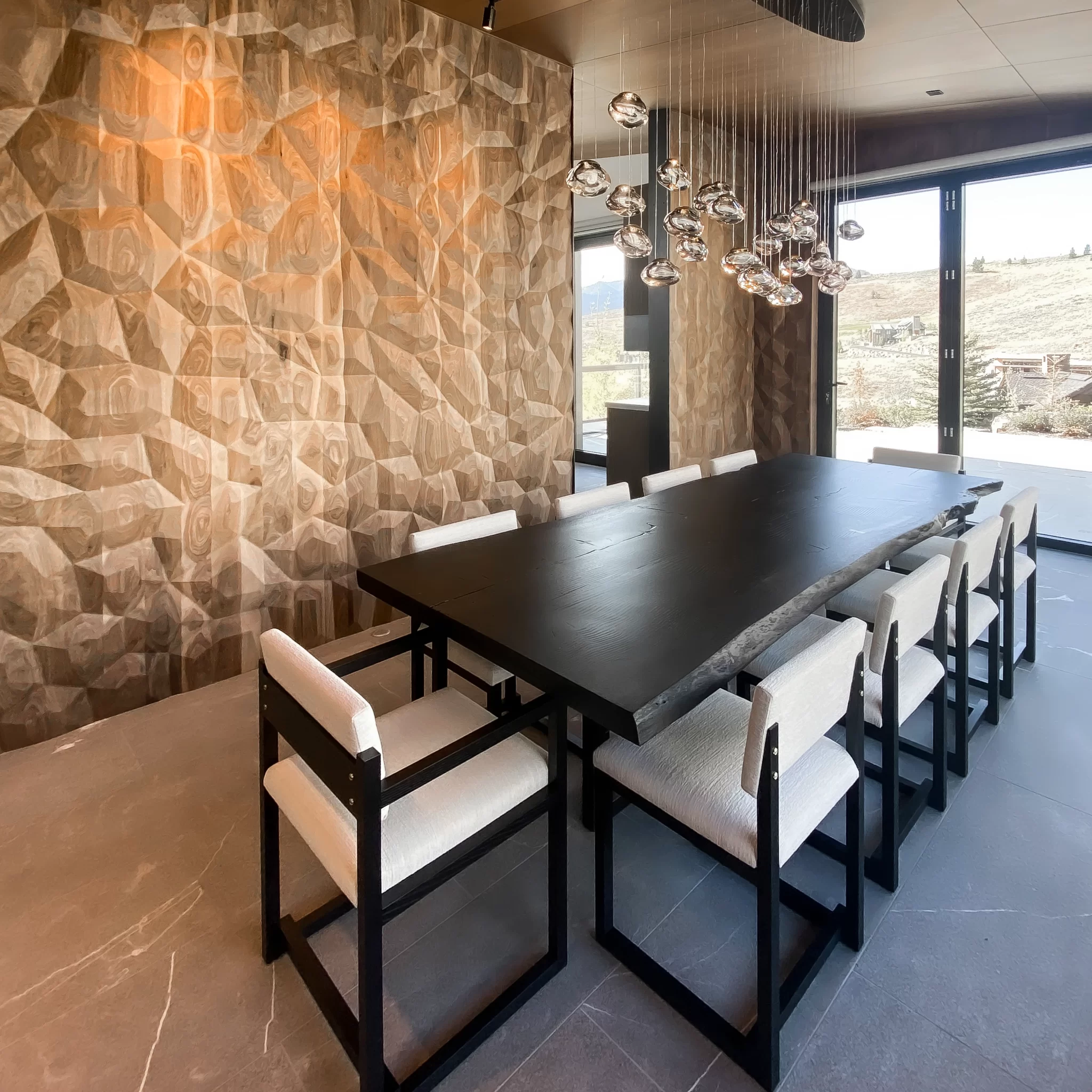 • Live-edge slabs integrated with contemporary bases