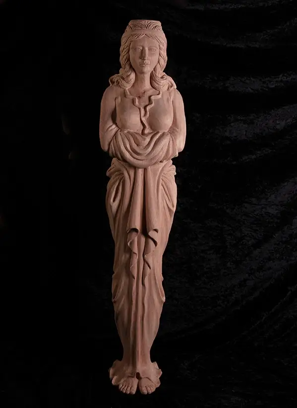 A full-length, hand-carved female form that blends structural function with fine art