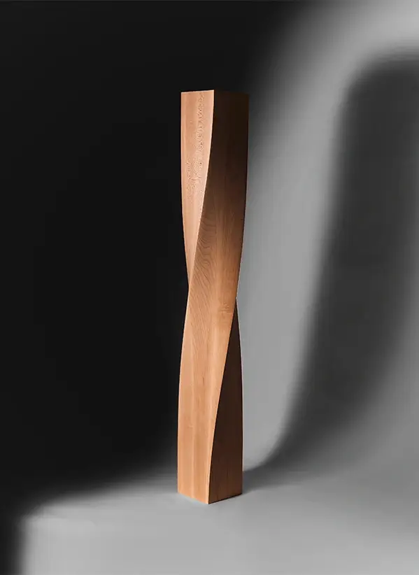 Exploring the intersection of geometric stacking and natural wood grain in bespoke furniture support