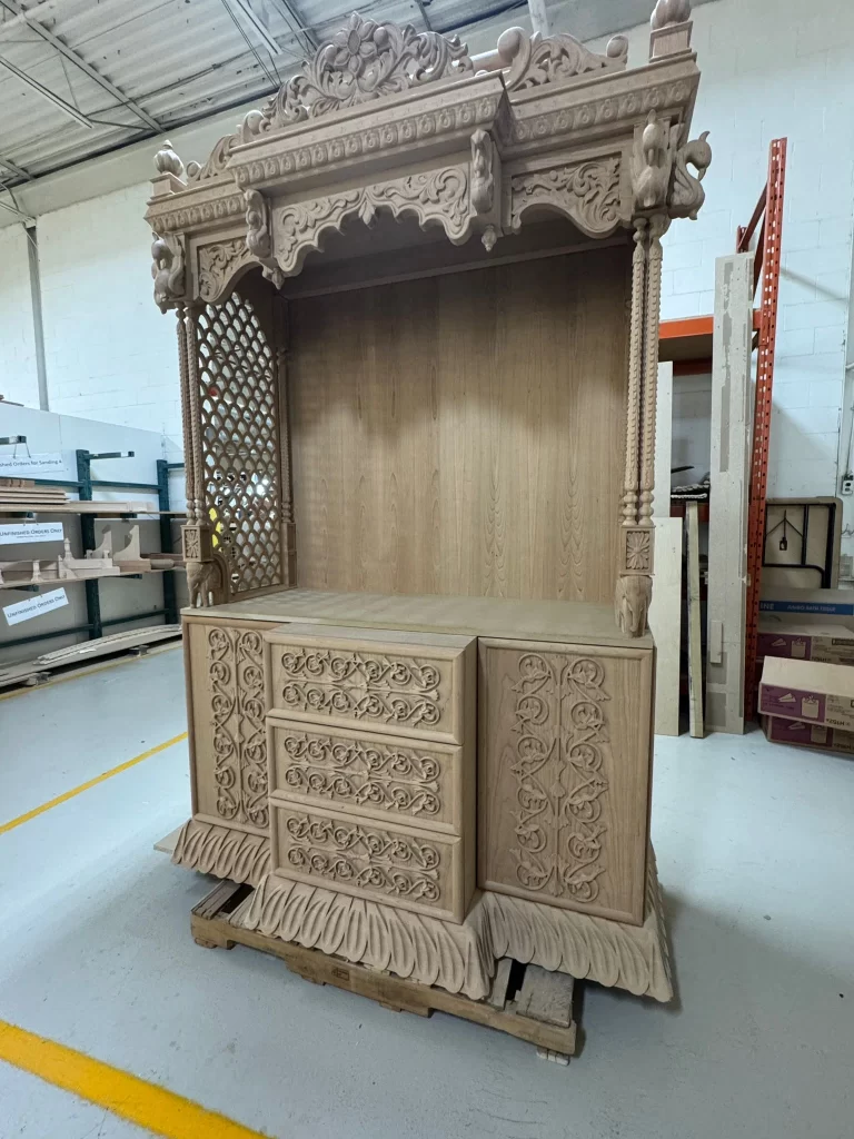 At Art for Everyday, we bring tradition to life through the art of custom woodwork. One of our recent creations — a hand-carved custom Pooja Ghar — beautifully reflects the harmony of spirituality and craftsmanship. Designed as a sacred space within the home, this bespoke Indian home temple features intricate carvings inspired by traditional Indian motifs, including majestic elephants and elegant peacocks, symbols of strength, wisdom, and beauty.