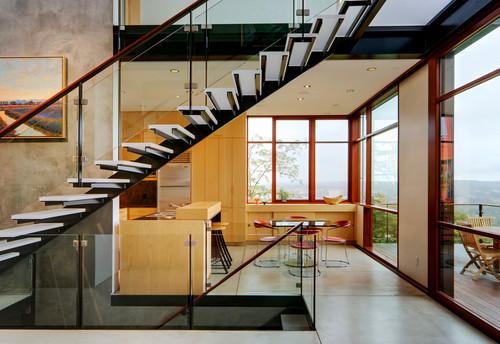 This elegant staircase utilizes architectural woodwork detailing to create a grand entrance in the home’s foyer: