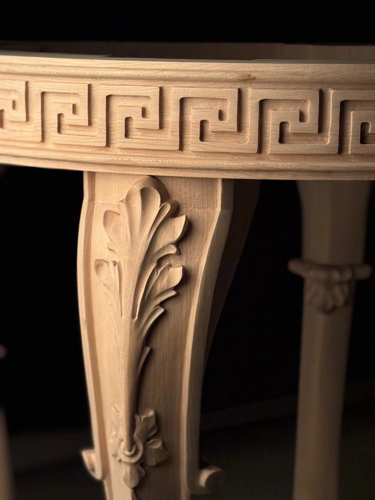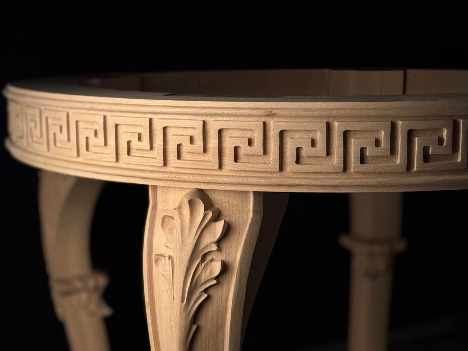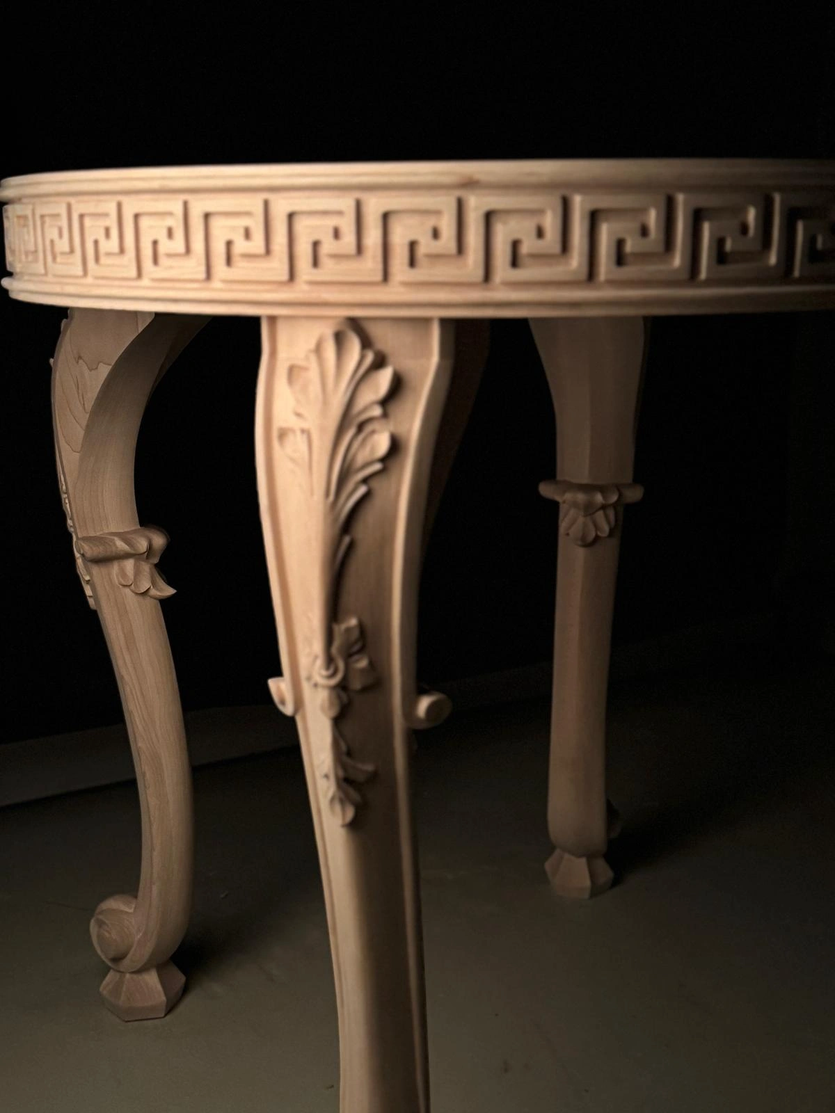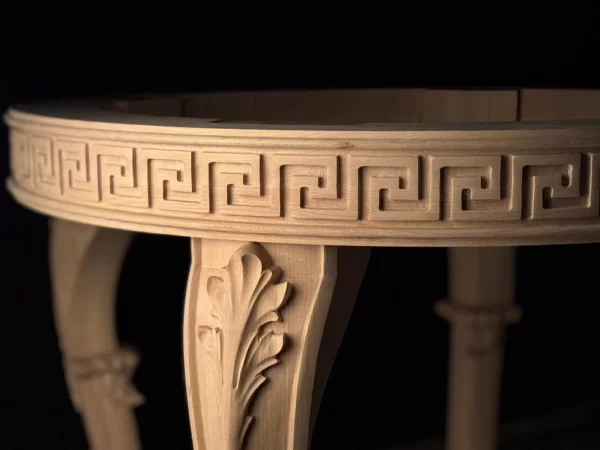 Keywords: hand-carved wood table, Greek key furniture, luxury accent table, classical round side table, neoclassical wooden table, artisan carved furniture, cabriole leg table, acanthus leaf carved table.